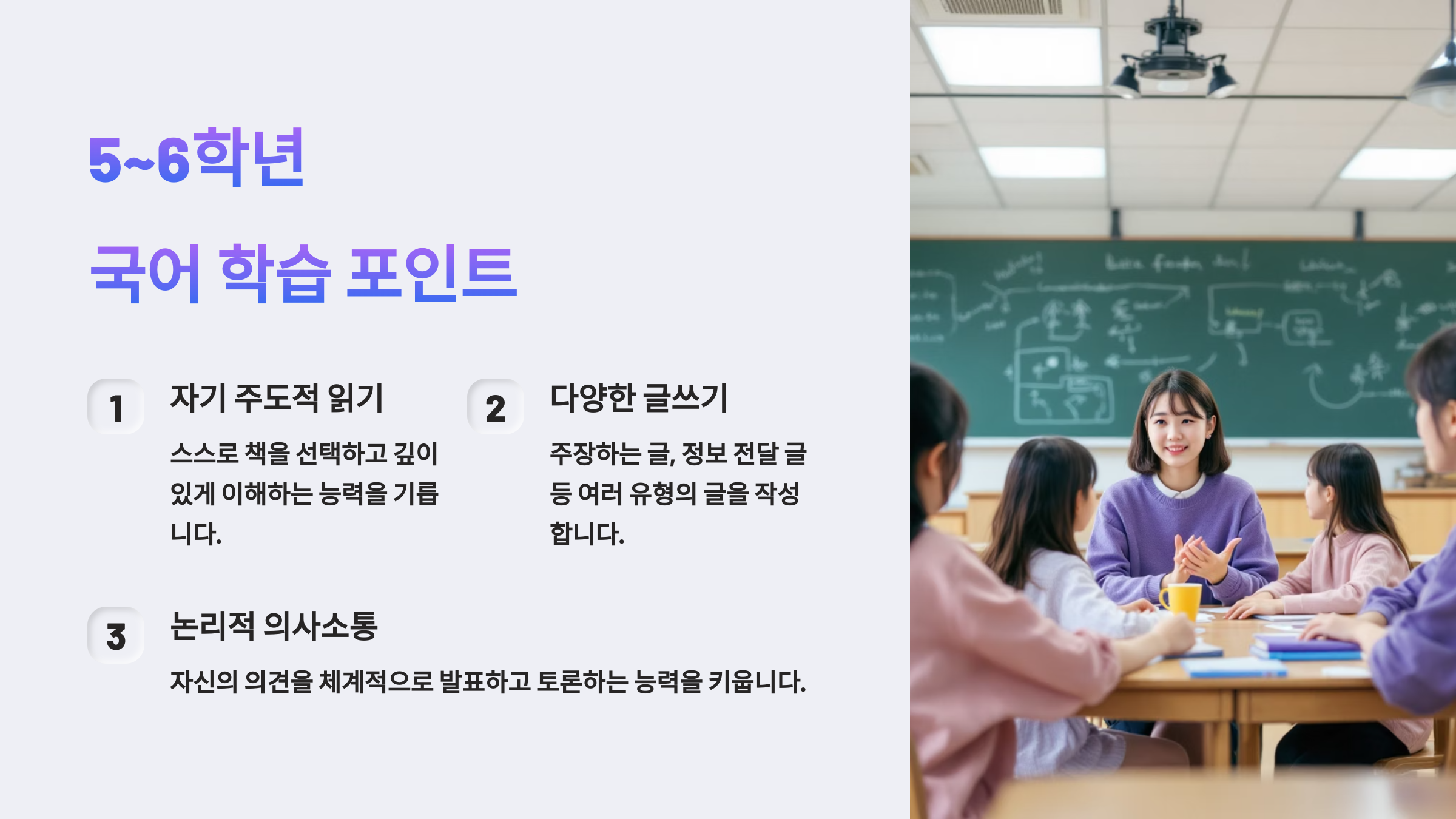 📘 초등 고학년(5~6학년)은 비문학 독해 능력 강화, 논리적 글쓰기, 토론 능력 강화가 목표예요.