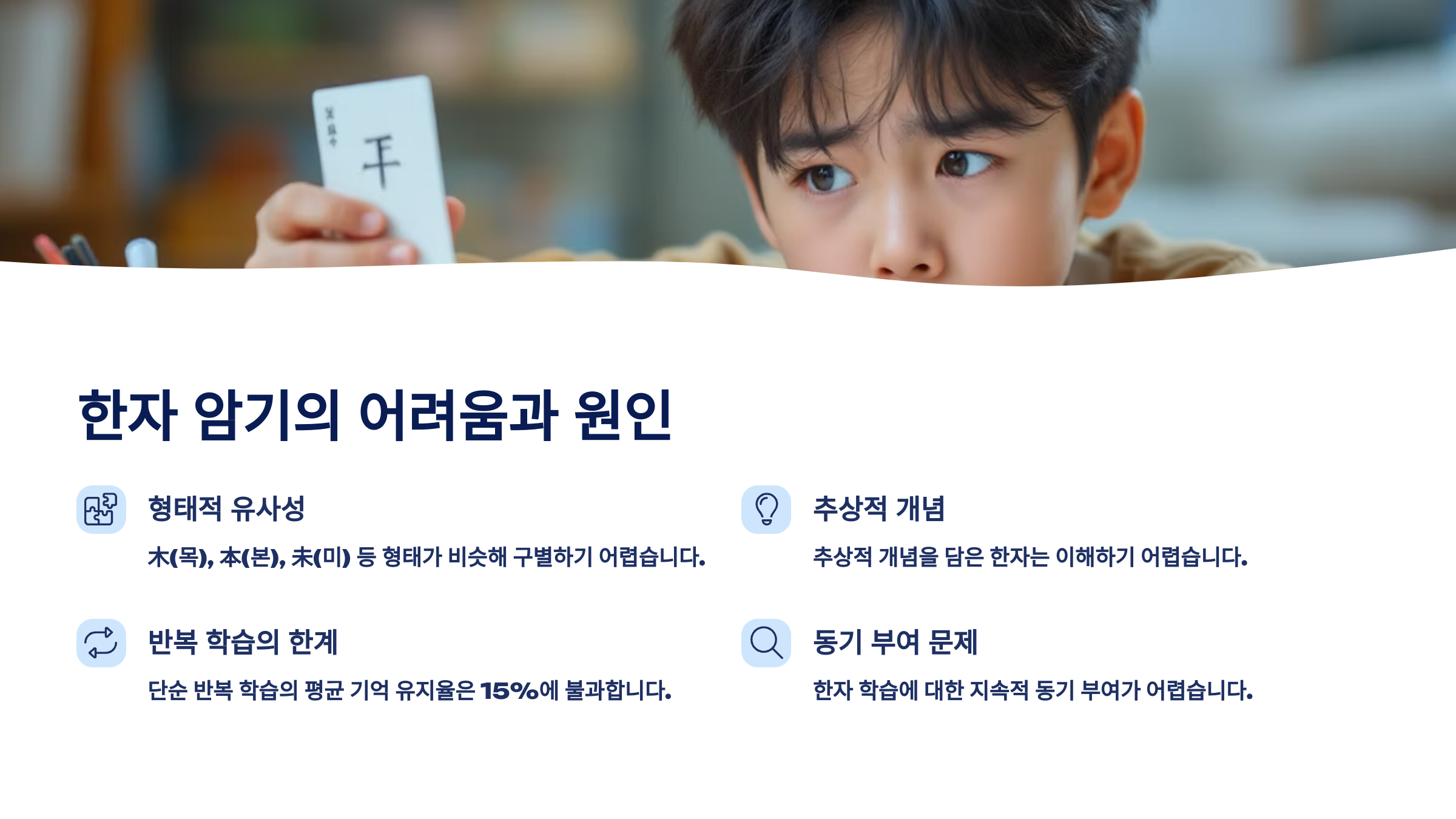 이제 다음은 📝 한자 암기의 어려움과 원인이에요. 아이들이 왜 한자를 힘들어하는지, 그 이유부터 정확히 짚어볼게요!