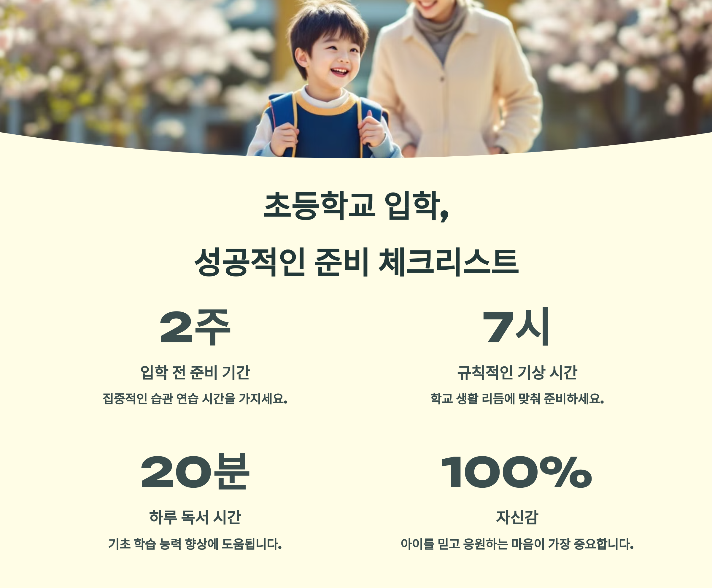 🌷 초등학교 입학은 설레는 출발이에요. 잘 준비해서 아이가 학교를 '즐거운 곳'으로 기억할 수 있도록 해주세요. 부모의 응원은 아이에게 가장 강력한 에너지랍니다.