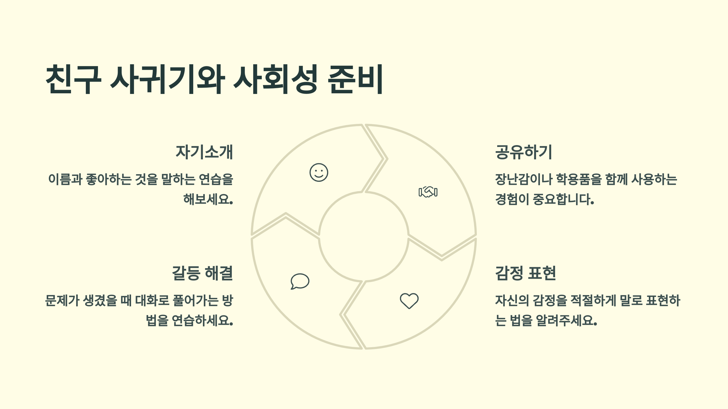 🤗 친구를 사귀고 관계를 유지하려면 먼저 기초적인 의사소통 능력이 필요해요. “같이 놀자”, “괜찮아?”, “미안해” 같은 말들을 자연스럽게 익히고, 상황에 따라 사용해볼 기회를 주는 게 좋아요.