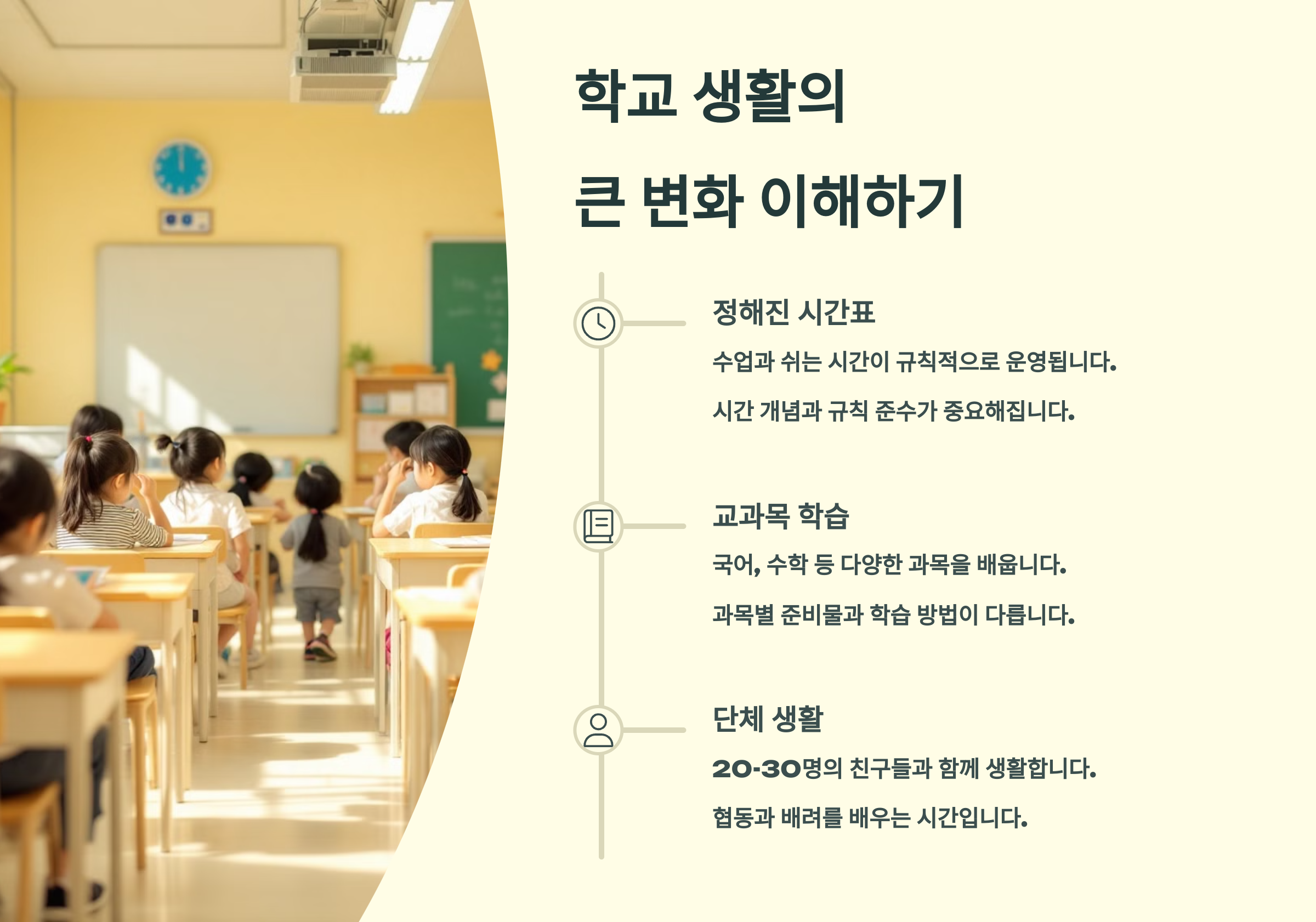 ⏰ 일과 시간도 달라져요. 보통 오전 9시 전까지 등교해서 오전 수업을 듣고, 오후에는 방과 후 활동이나 숙제를 하게 돼요. 정해진 시간에 맞춰 움직이는 생활 리듬의 변화는 아이에게 큰 적응이 필요하답니다.