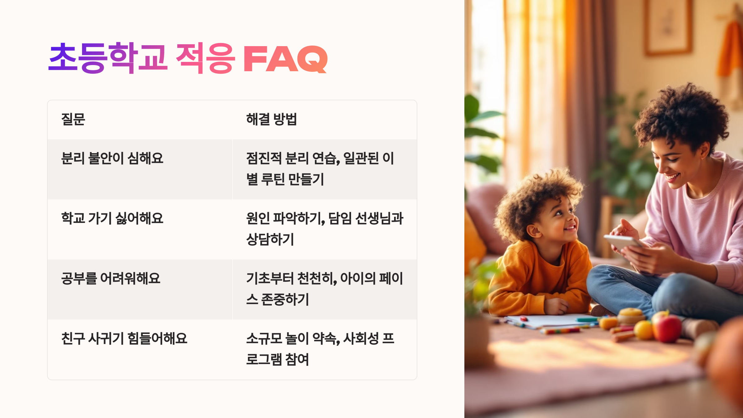 A1. 초등학교는 새로운 환경이라 처음엔 누구나 낯설고 불편하게 느낄 수 있어요. 아이의 감정을 인정해주고, “그럴 수 있어, 엄마도 처음 학교 갈 땐 떨렸어”라고 말해보세요. 공감과 기다림이 가장 좋은 첫걸음이에요.