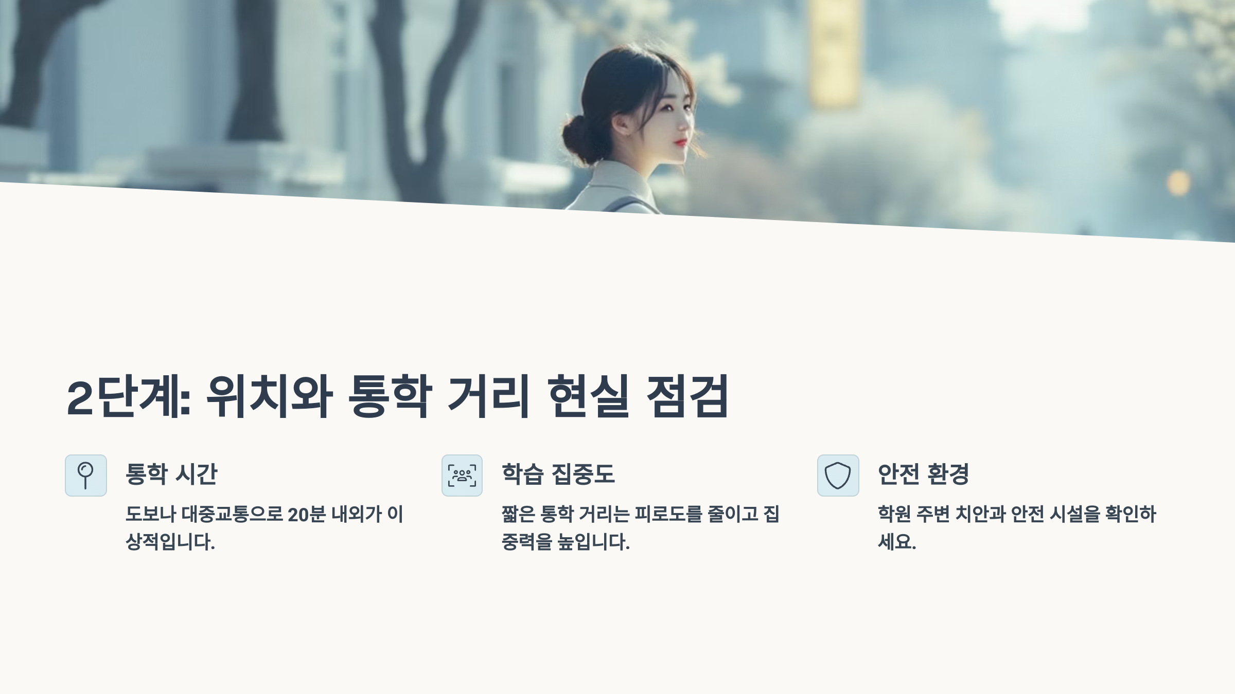 📌 좋은 학원 선택의 두 번째 기준은 위치입니다. '집에서 도보 10분 이내', '버스 1번 환승', '하교 후 이동이 쉬운 동선' 등을 기준으로 현실적인 통학 경로를 먼저 확인해보세요.