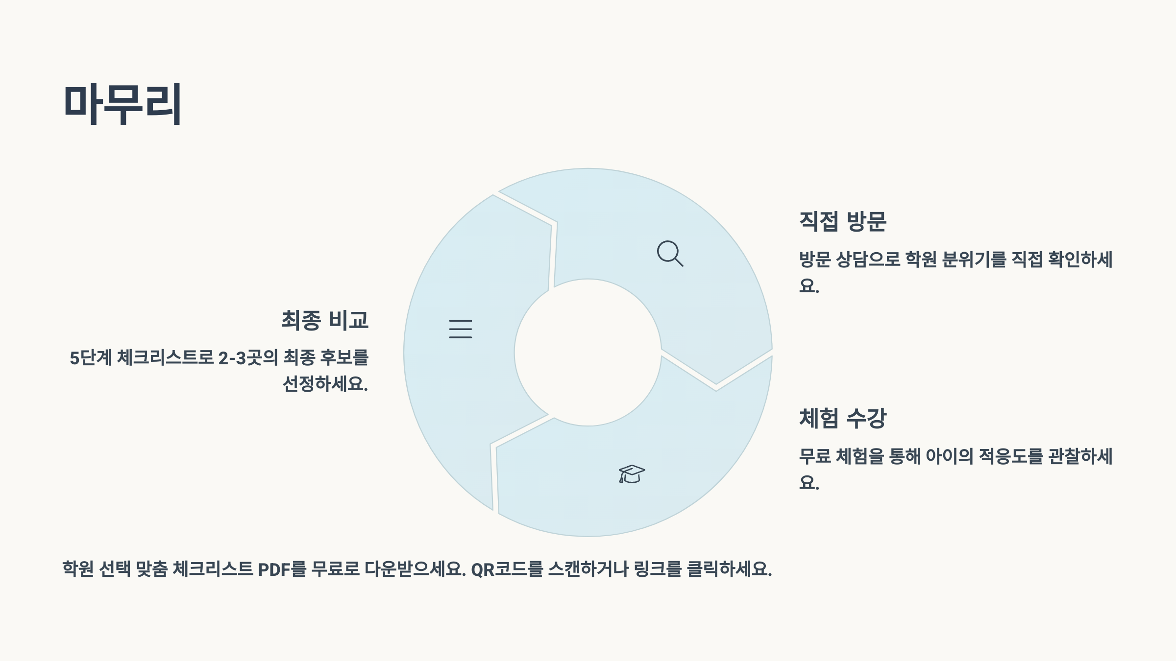 지금까지 좋은 학원 선택을 위한 5단계 체크리스트를 살펴봤어요! 다음은 자주 묻는 질문들, FAQ 코너로 이어집니다. 👇