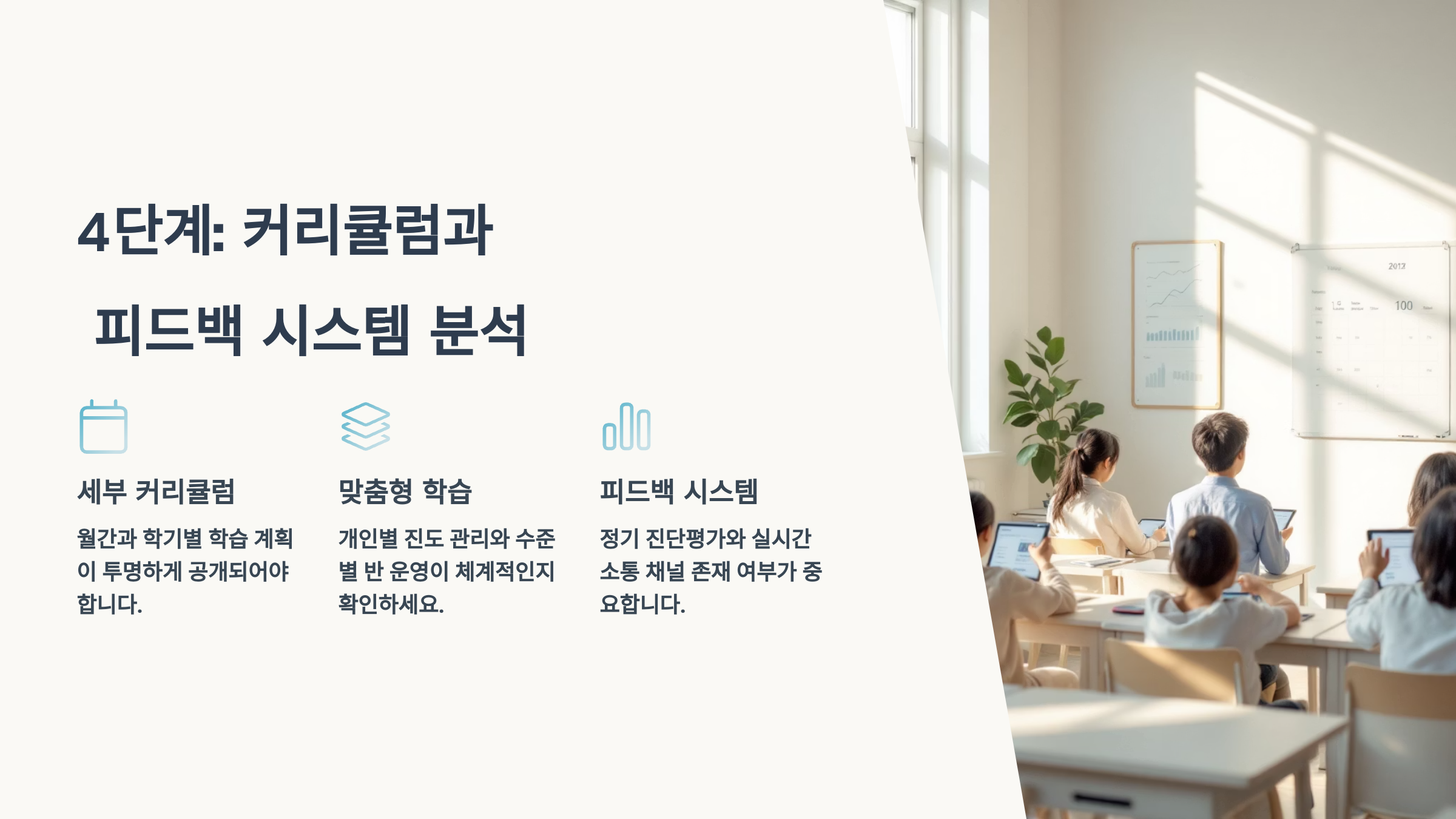 👂 실제 후기와 커뮤니티 정보도 참고해보세요. 다만 후기는 주관적일 수 있으니 아이의 학습 스타일과 맞는지를 중심으로 판단하는 게 중요해요. 다음은 커리큘럼과 시스템을 체크하는 4단계로 넘어가볼게요! 📊