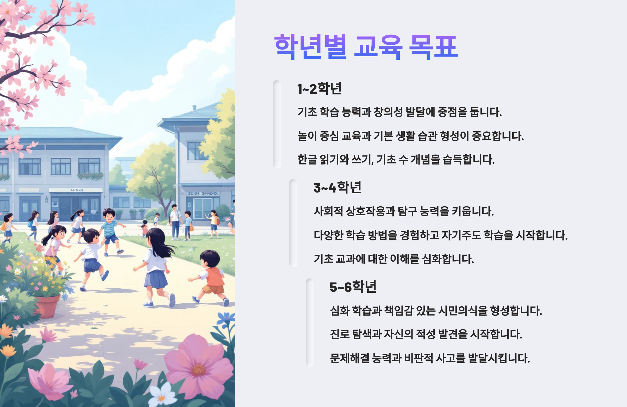이제 ‘왜 그 과목을 배우는지’, ‘그걸 배우면 어떤 힘이 자라는지’ 한눈에 보이기 시작했죠? 😄 다음 섹션은 📊 학년별 교육 목표예요! 1학년부터 6학년까지 단계별로 어떤 성장 목표가 있는지 알려드릴게요!
