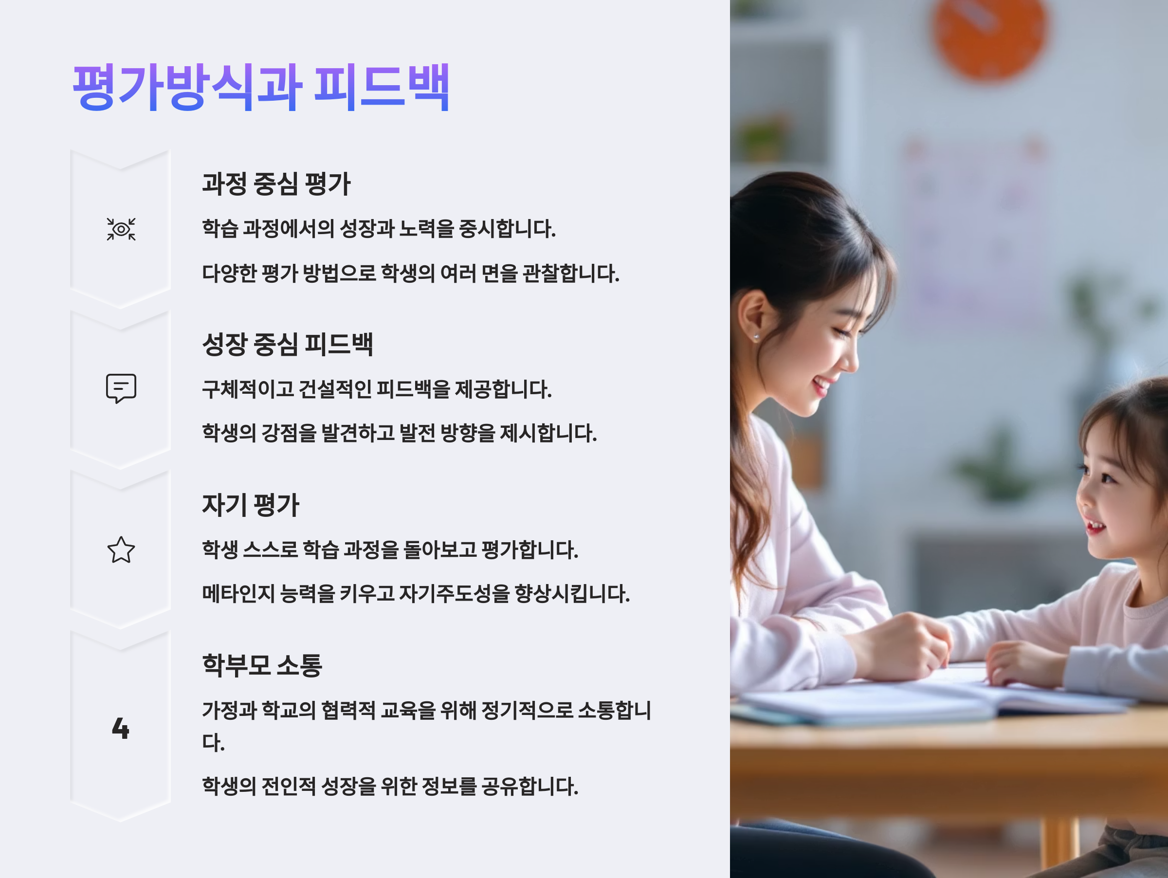 또한 과정 중심 평가는 결과뿐 아니라 학습에 임하는 태도, 참여도, 사고과정도 함께 평가해요. 그래서 아이들이 평가에 대한 부담을 덜고, 학습 과정에서 더 많은 성장을 경험할 수 있어요 🌿💬