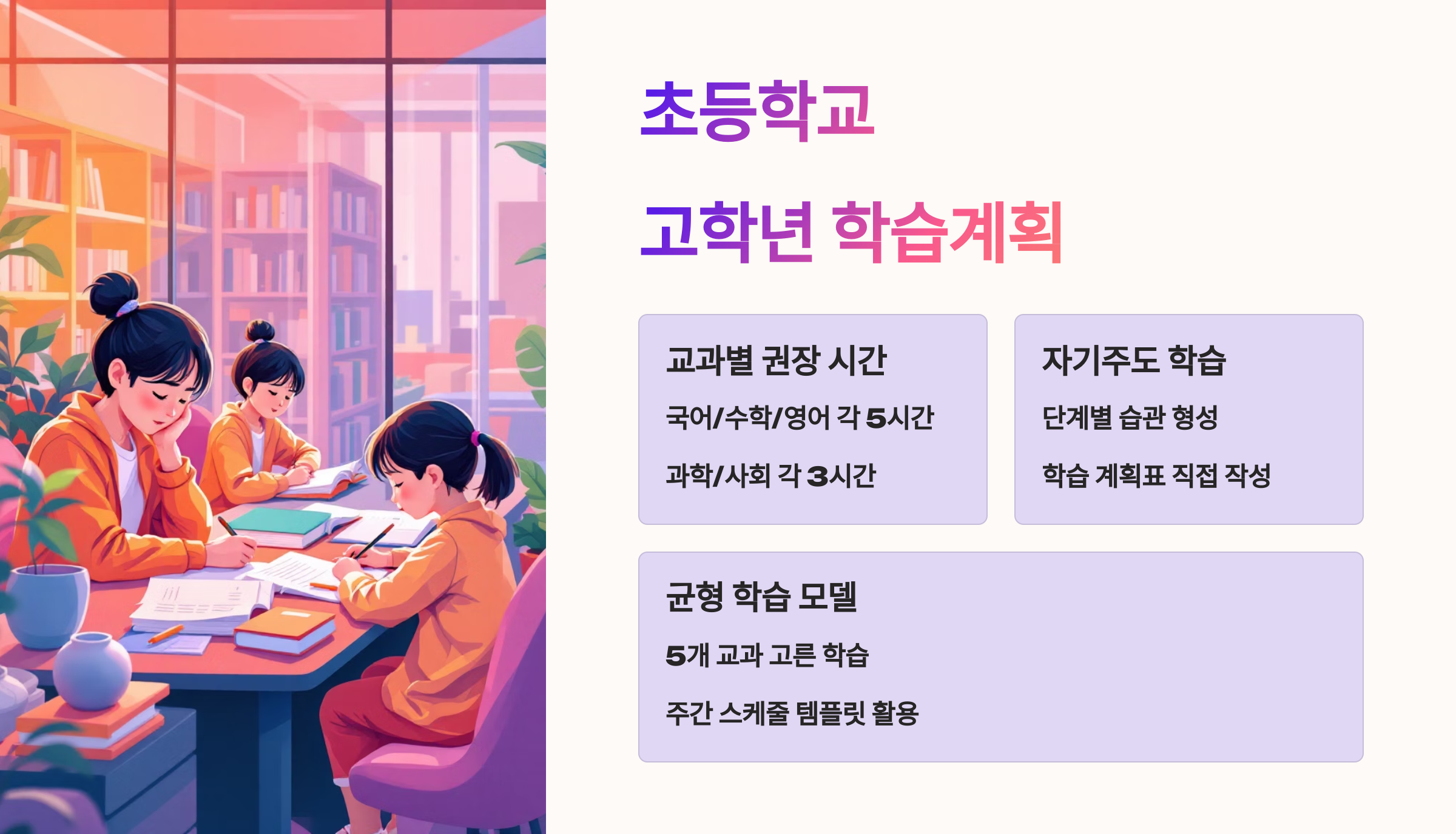 🖋️ 초등 고학년은 과목별로 학습 계획을 세워야 해요. 국어는 독해력 강화, 수학은 문제 해결 능력 향상, 사회·과학은 이해력과 암기력을 함께 키워야 하죠. 📖➕🌎🔬