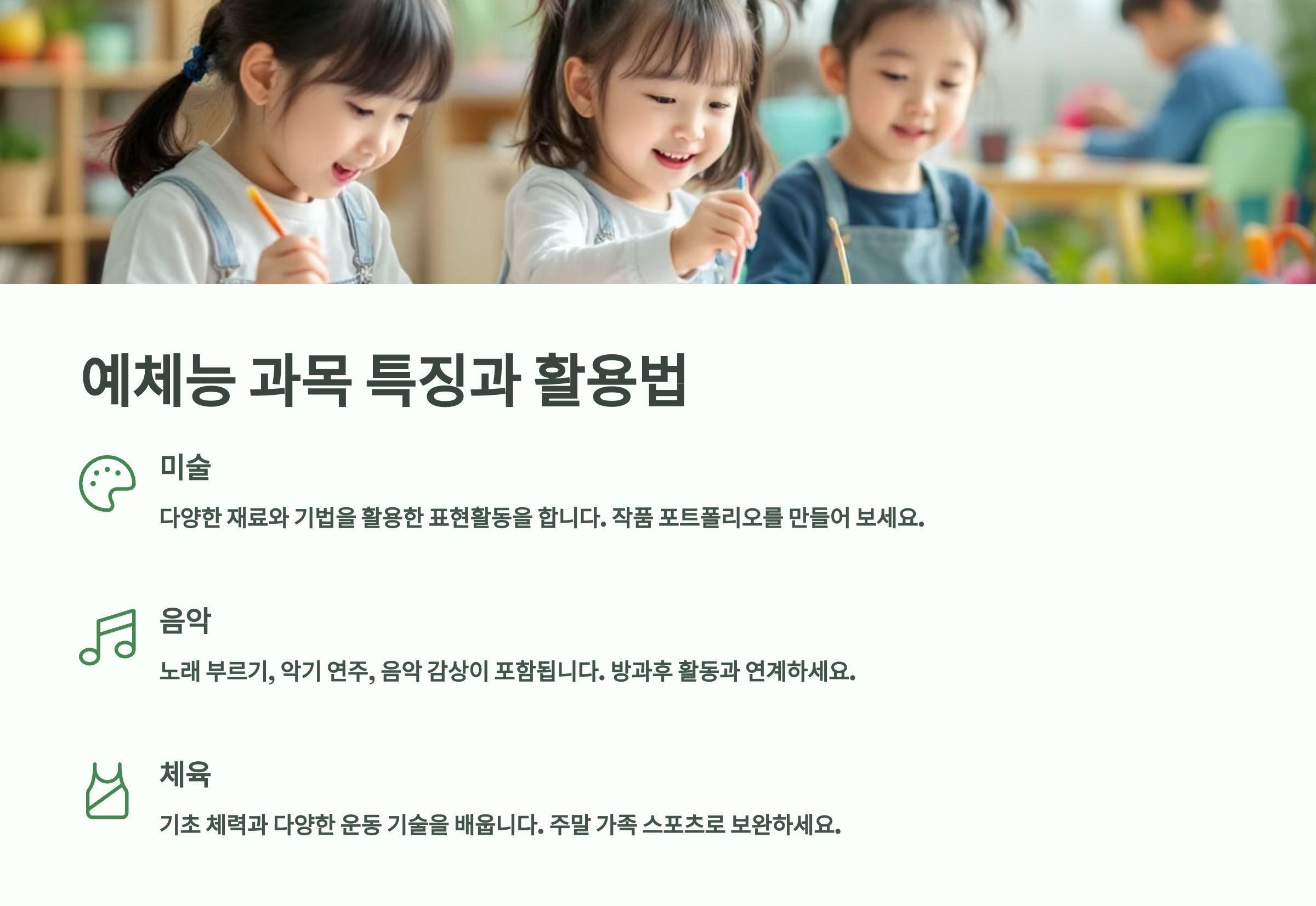 🎨 다음은 국·영·수 외에도 중요한 예체능 과목 특징과 활용법을 살펴보자! 이 과목들이야말로 아이들의 정서와 균형 잡힌 성장을 책임지는 핵심이니까!