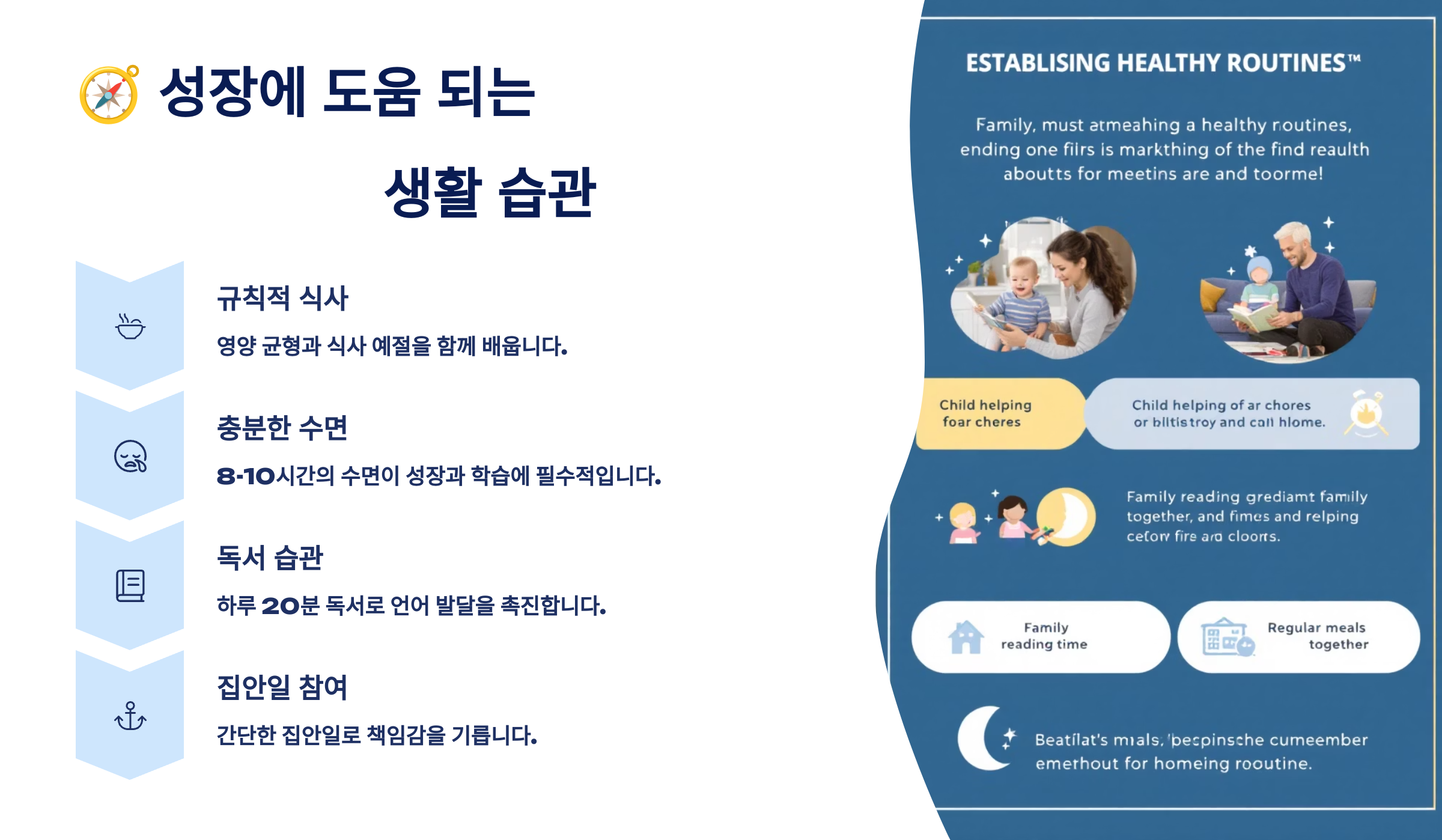 🍚 규칙적인 식사와 건강한 식습관도 기본 중의 기본이에요. 인스턴트보다는 가정식 위주로, 다양한 식재료를 접하게 해주세요. 편식을 줄이는 것도 이 시기에 교육해야 할 부분이에요. 밥상머리 대화도 함께 하면 더 좋아요!
