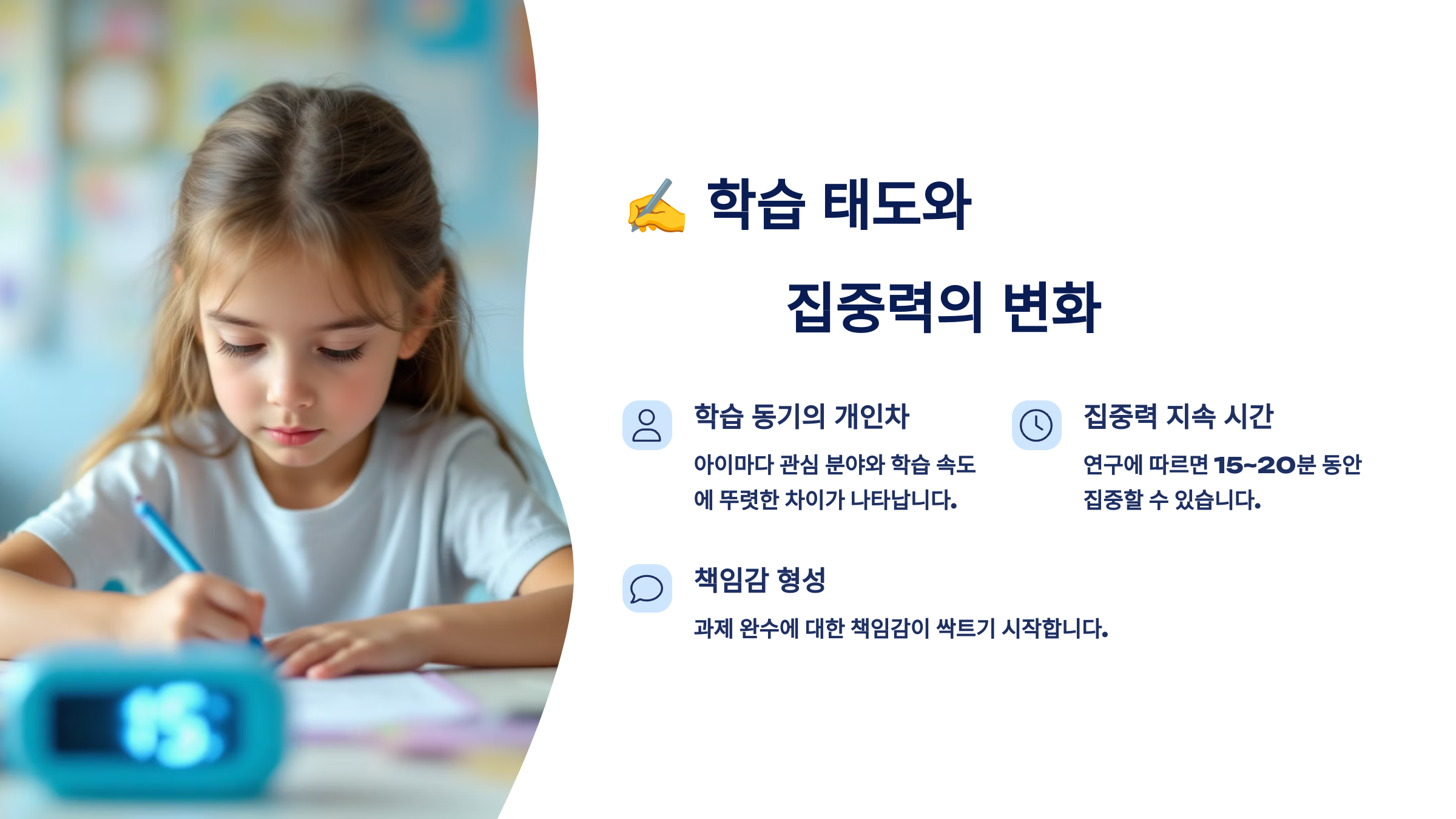 💡 학습 습관을 잡아주기 위해선 ‘짧고 집중적인 학습’이 좋아요. 20~30분 학습 후 짧은 휴식, 다시 학습하는 루틴이 집중력 향상에 효과적이에요. 시간보다 질에 초점을 맞춰주는 게 이 시기에는 훨씬 중요해요.
