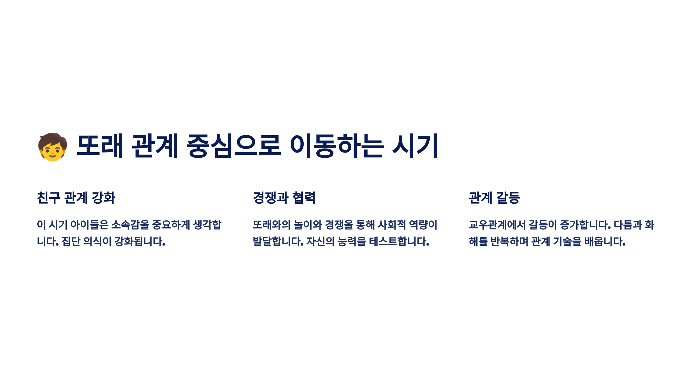 📌 또래 중심의 발달이 본격화되는 시기이므로, 친구 관계에 대한 민감한 관찰이 필요해요. 친구와의 다툼이 너무 자주 일어난다거나, 반대로 지나치게 위축돼서 혼자만 있는 경우라면 부모가 조금 더 관심을 가져야 해요.