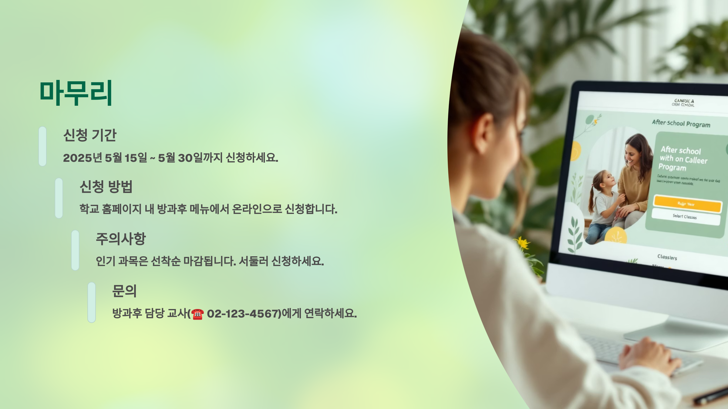 제가 생각했을 때 방과후 수업은 ‘가장 아이답게 배우는 시간’이에요. 학원식 공부보다 아이가 먼저 좋아하고 기다리는 수업이야말로, 진짜 성장의 발판이 된다고 믿어요. 부모님이 아이의 이야기에 귀 기울이고 함께 선택해주신다면, 방과후 수업은 분명 최고의 배움이 될 거예요!